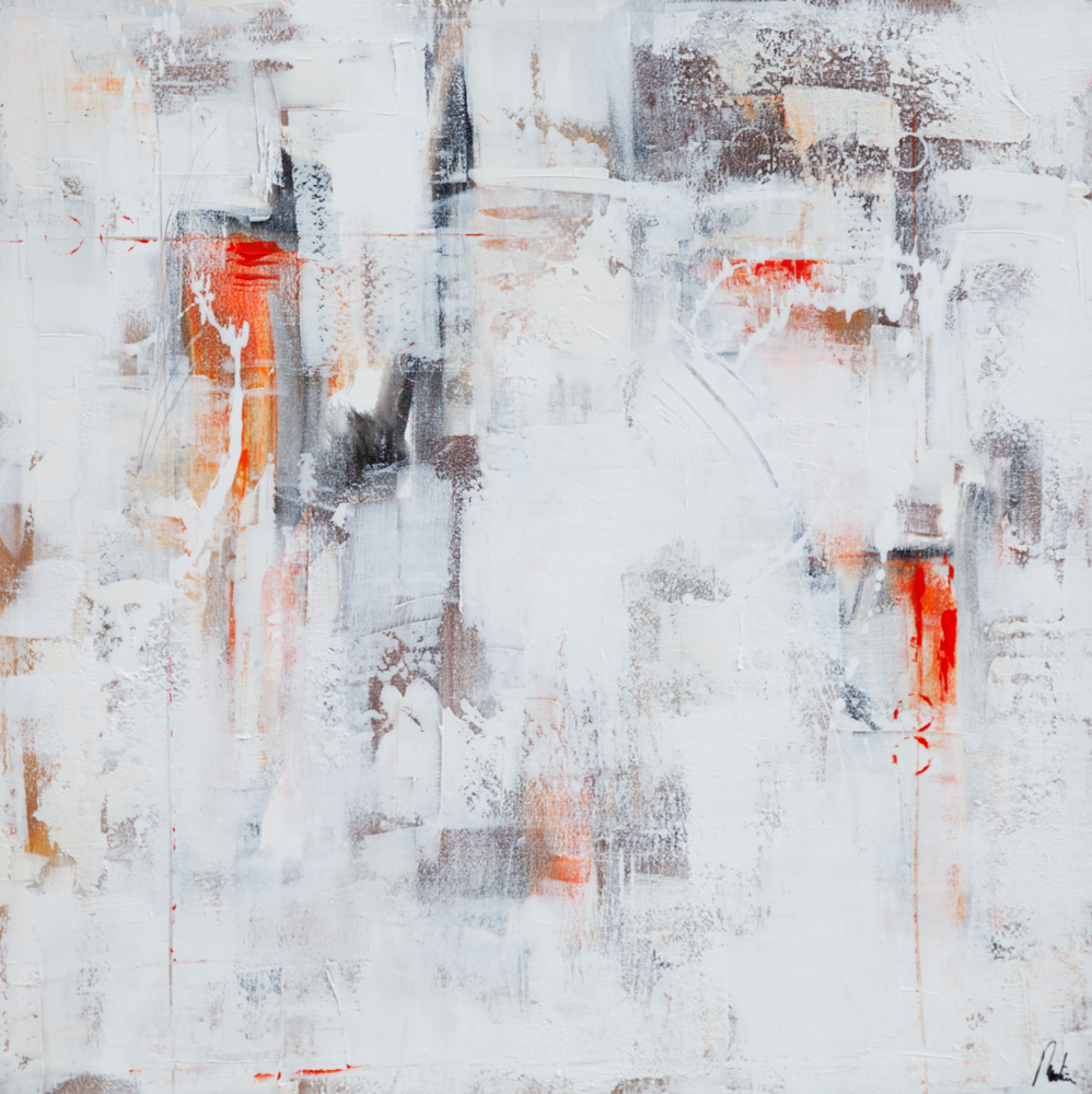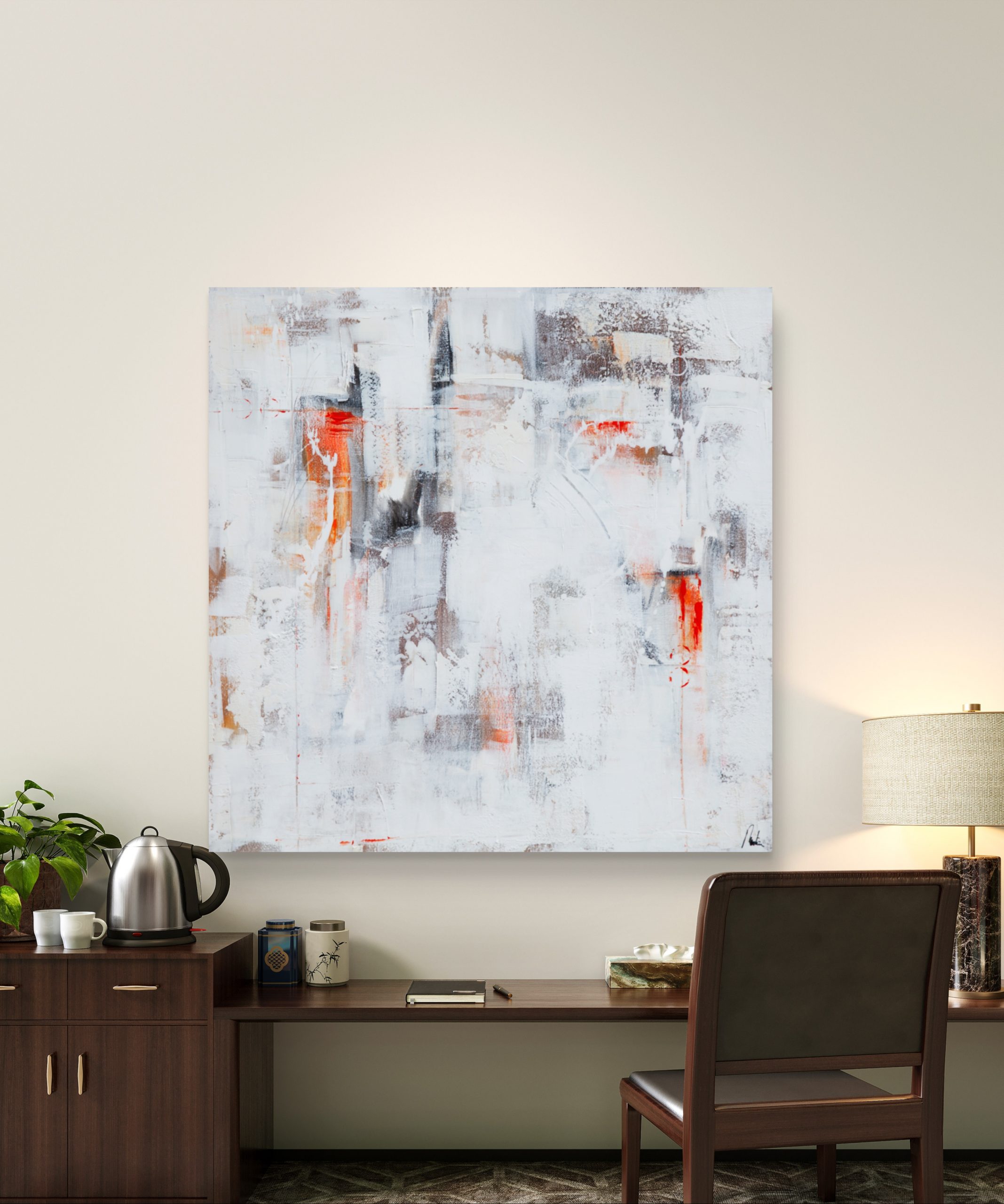 Este cuadro podría interpretarse como una reflexión sobre la luz y la energía que surge del encuentro entre el día (representado por el blanco) y la noche (sugerida por el vibrante naranja de los atardeceres o los cielos al final del día). La obra invita a una experiencia sensorial que celebra la vitalidad y la armonía que nace de la interacción entre colores tan contrastantes pero complementarios.