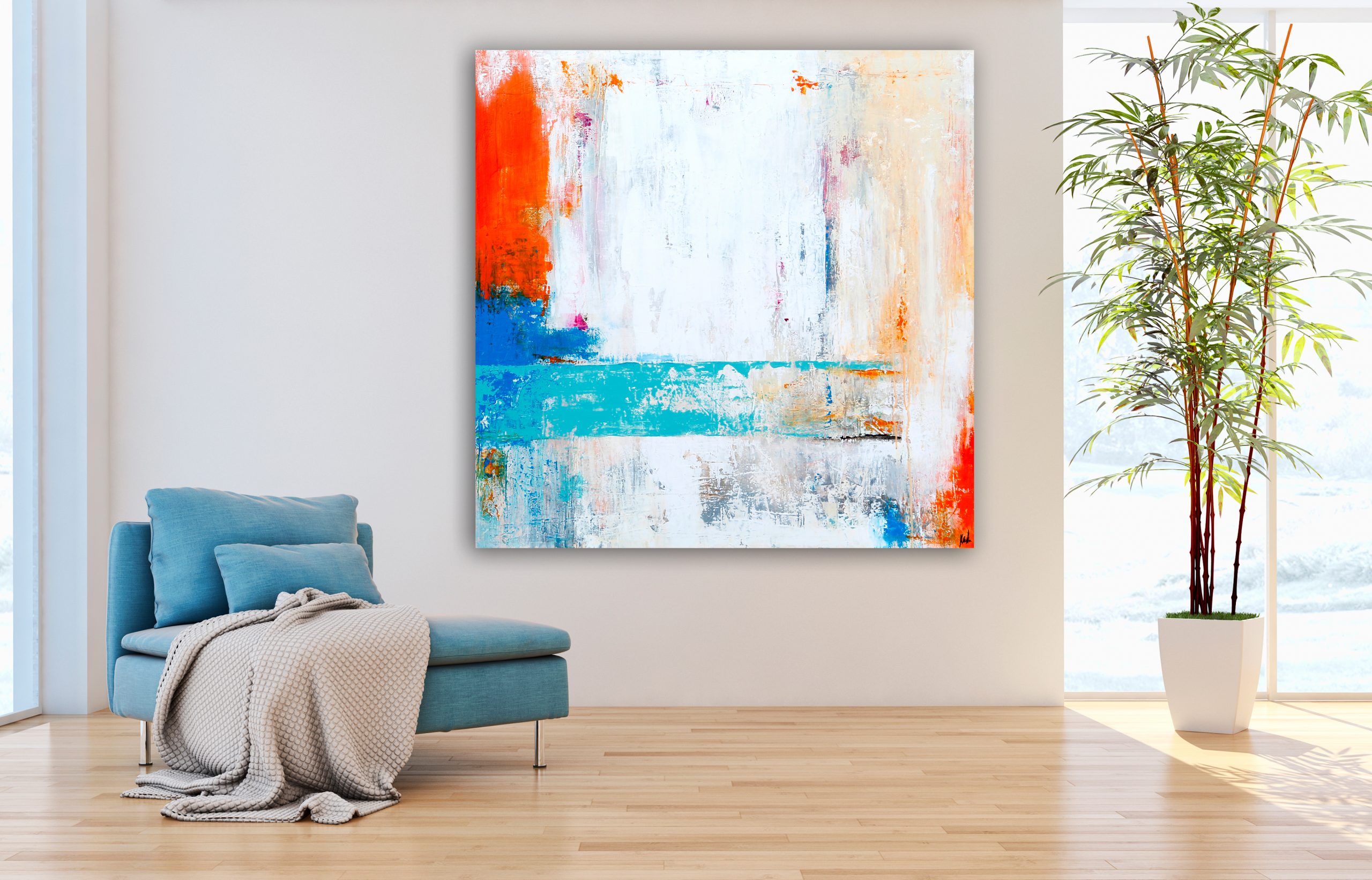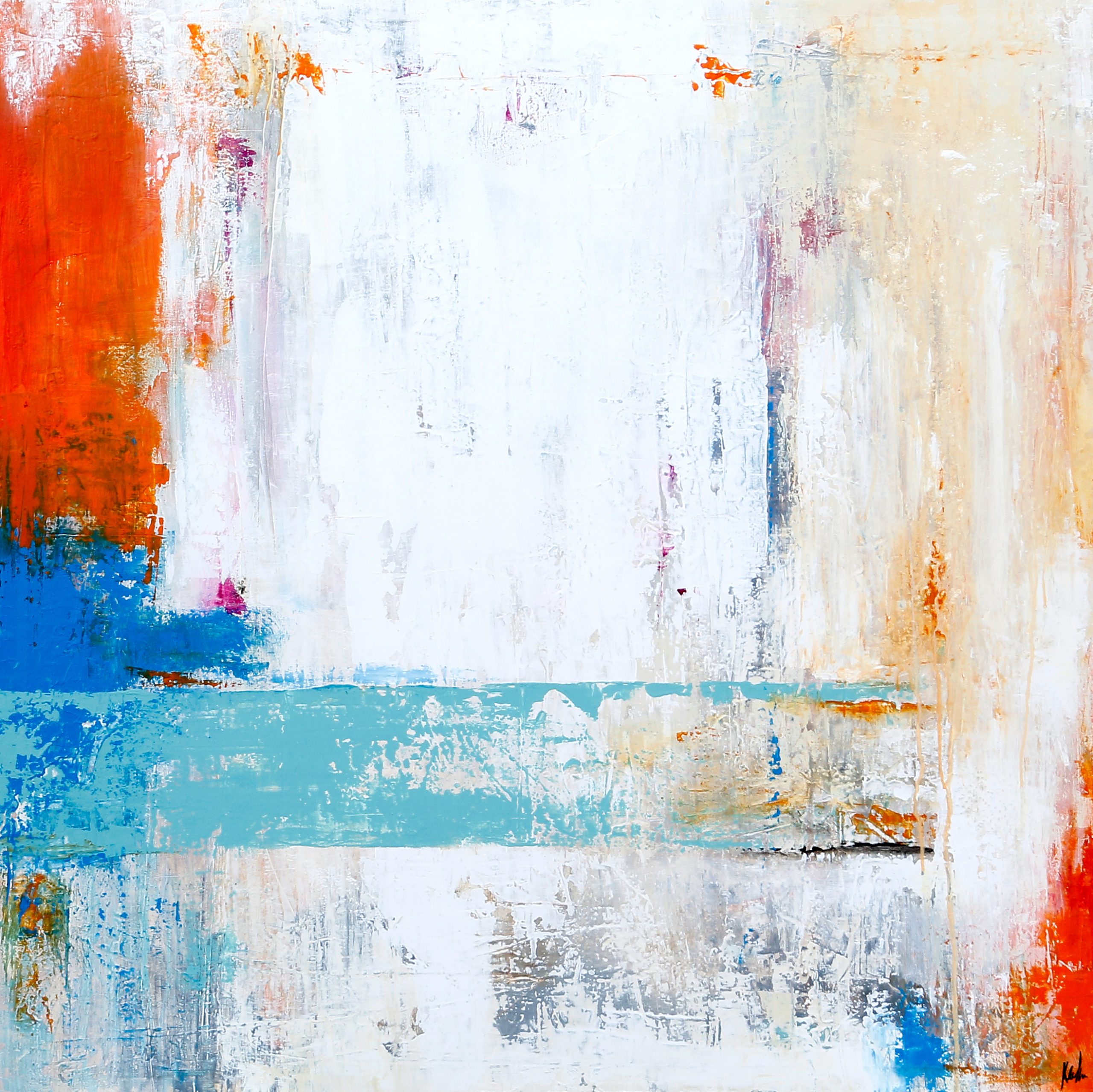 Este cuadro, en su danza de colores, nos habla de la armonía que puede existir entre lo sereno y lo vibrante, entre la frescura y el calor. Nos invita a vivir el momento, a abrazar la dualidad de la vida: la tranquilidad del turquesa, la pasión del naranja y la pureza del blanco. Es una celebración del color, de la luz, y de la energía que nos rodea y nos inspira.