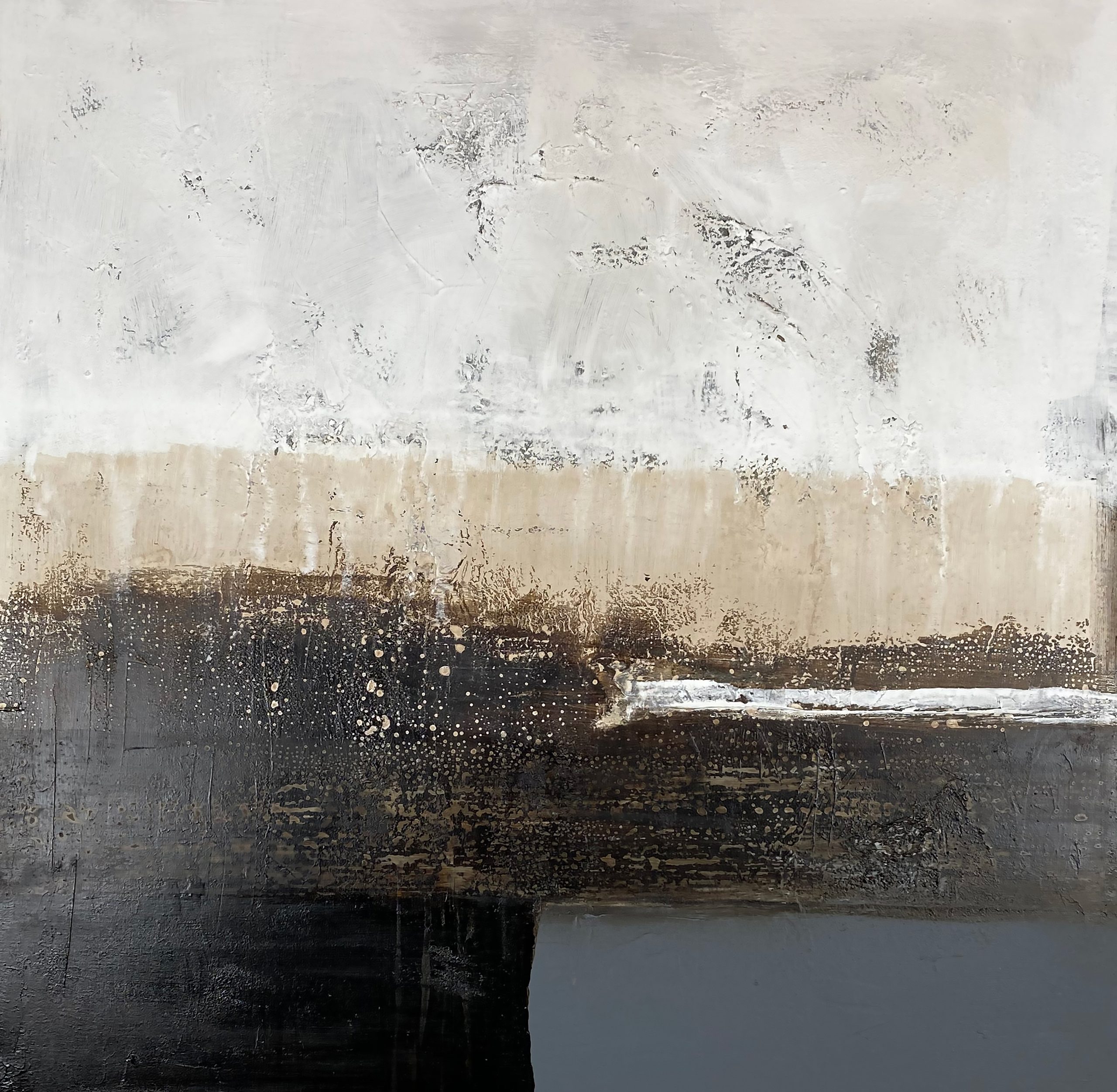 El cuadro, en su combinación de blancos, grises y cremas, nos invita a reflexionar sobre lo transitorio y lo eterno. La calma del blanco se encuentra con la solidez del gris, y las gotas nos recuerdan que, incluso en el silencio, el tiempo sigue su curso.