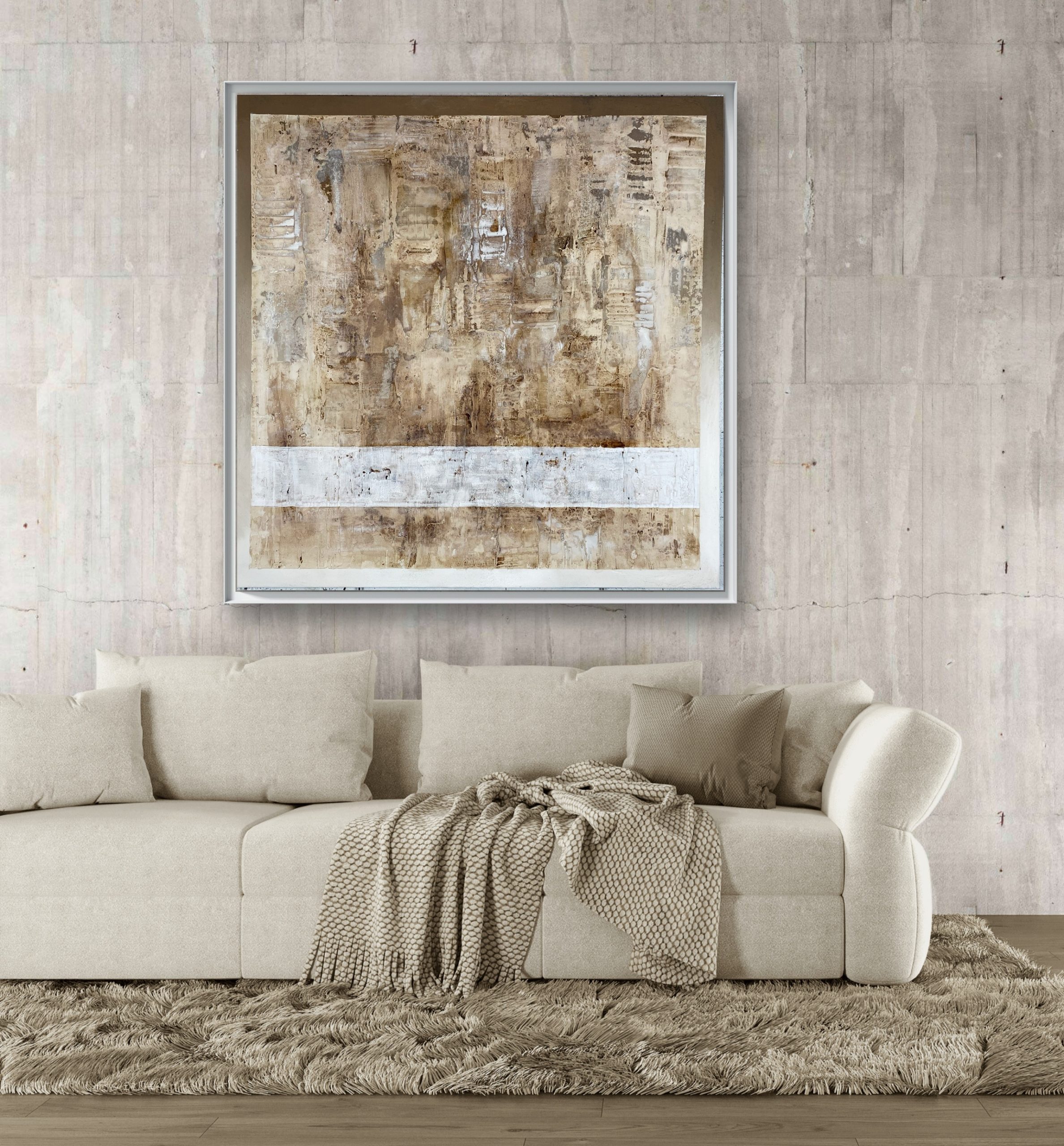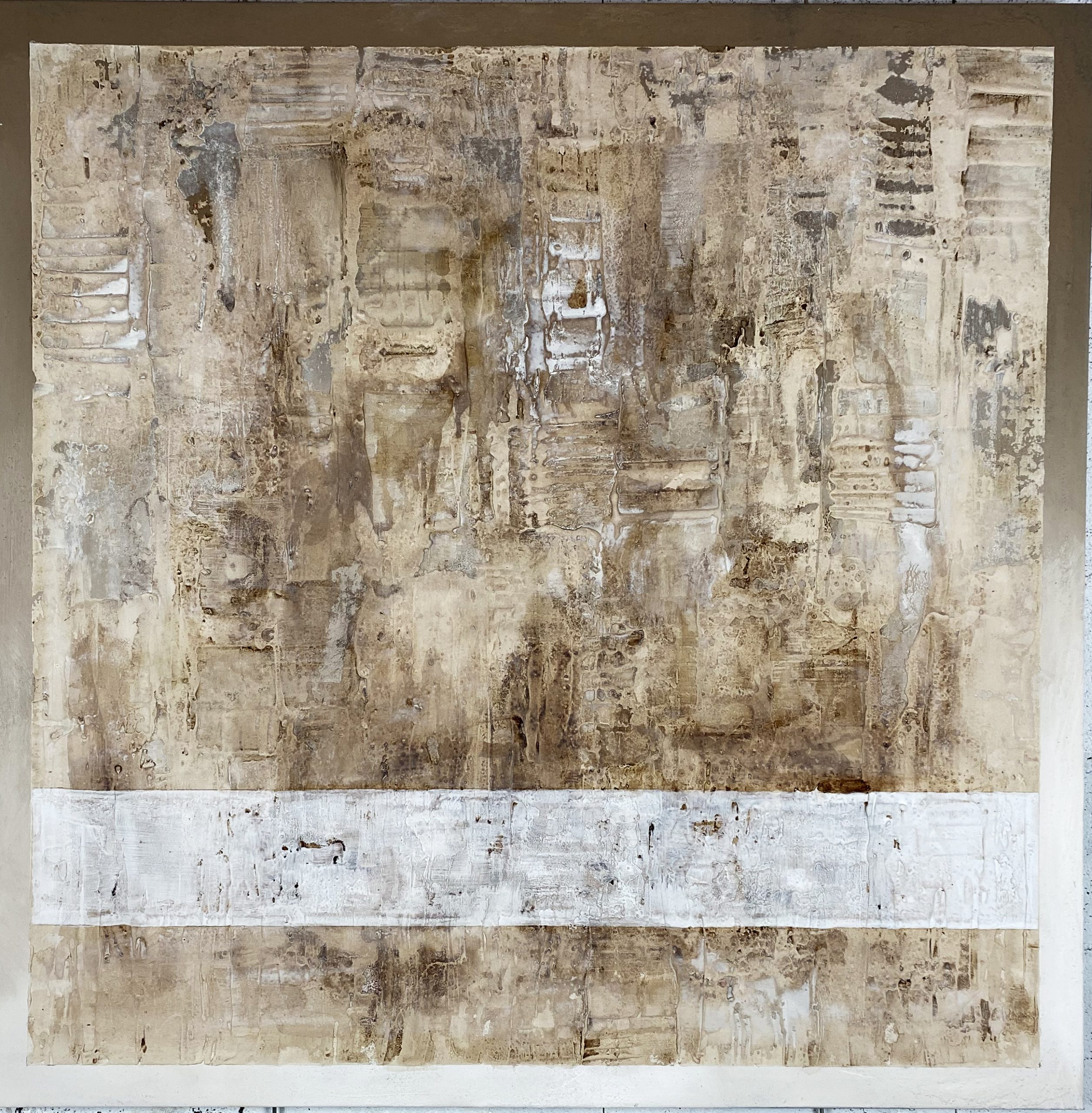 En medio de la oscuridad, los blancos rotos emergen como fragmentos de claridad, dispersos, como si lucharan por salir a la superficie. Este blanco, que ya no es puro, se desdibuja, se difumina entre las manchas que recorren el lienzo. Estas manchas, sin forma definida, aportan una sensación de desorden controlado, como si el tiempo hubiera dejado su huella de manera impredecible y orgánica.