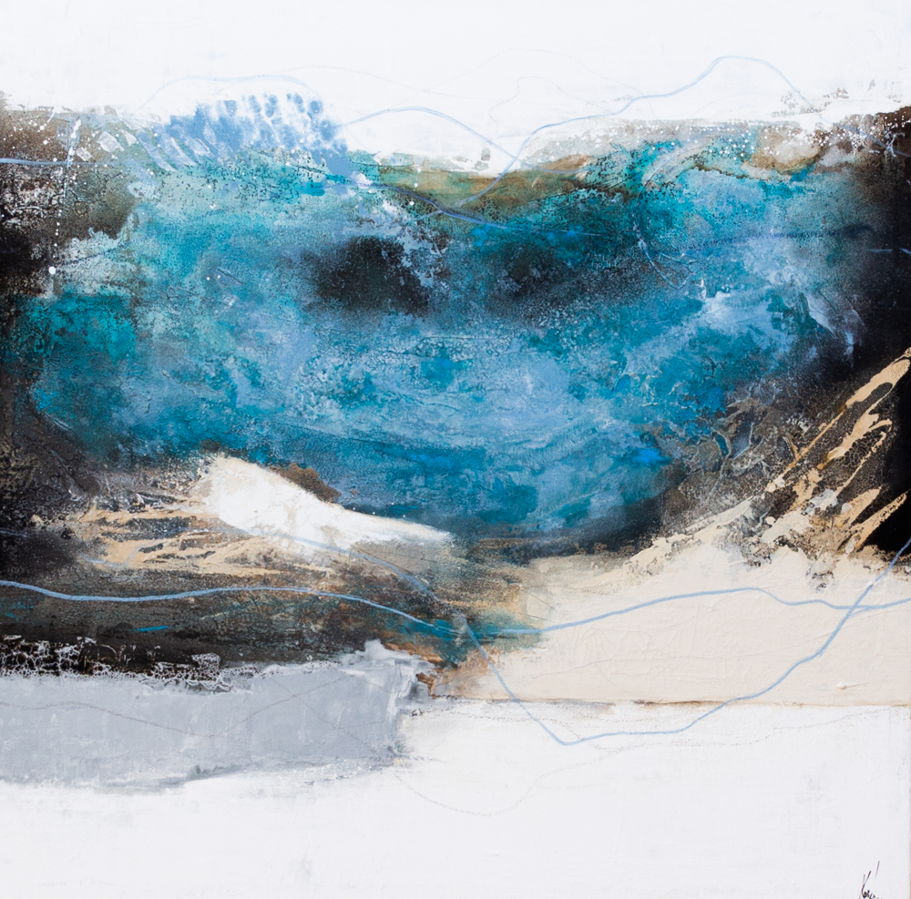 Sumérgete en la profundidad y la energía de esta cautivadora pintura abstracta. Una explosión de azules vibrantes, desde celestes etéreos hasta turquesas intensos, domina el lienzo, creando una sensación de movimiento y profundidad que invita a la contemplación.