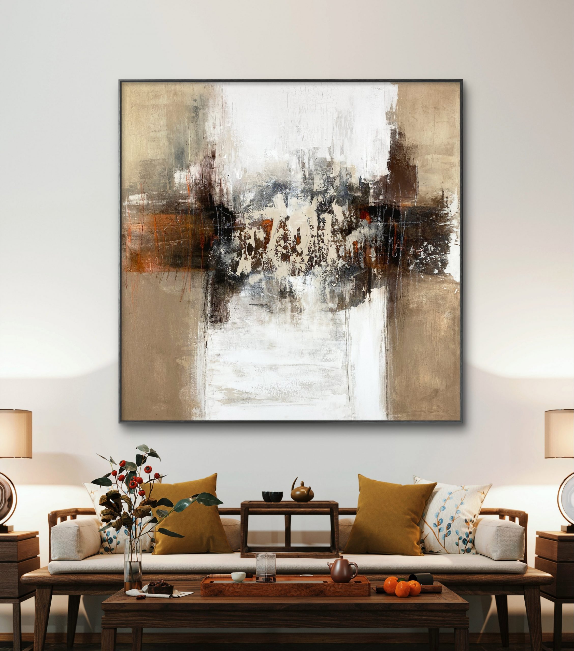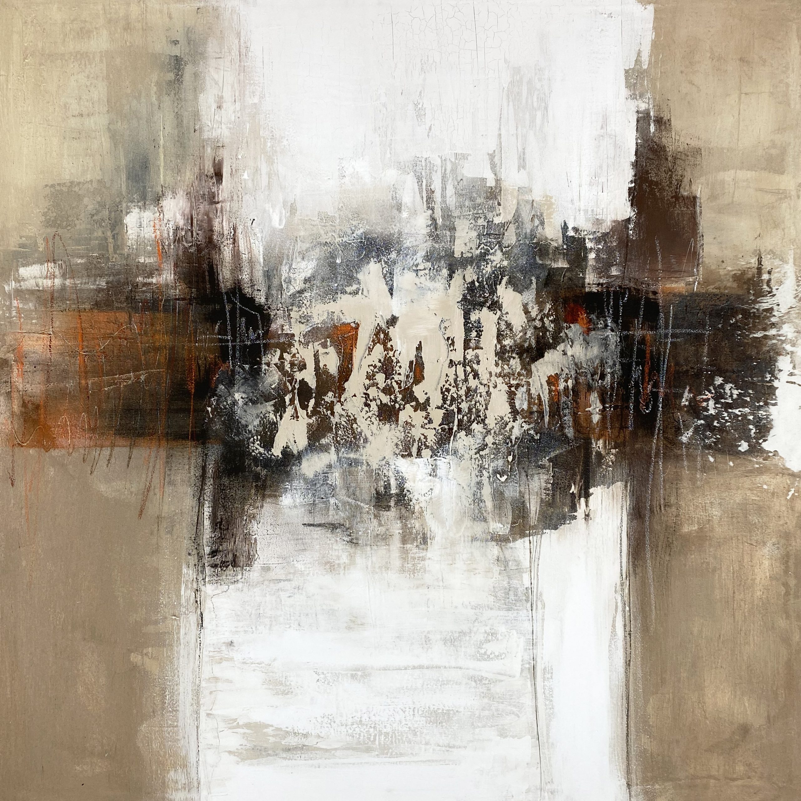 El lienzo se extiende en un mar de tonos tierra, cálidos y orgánicos, como la quietud de la tierra antes de la tormenta. Estos colores, que evocan la naturaleza y el paso del tiempo, establecen un fondo sólido, un espacio de reflexión, donde el silencio es palpable y profundo. Cada trazo de tierra es como una huella, una marca que recuerda las raíces que nos anclan a la vida.