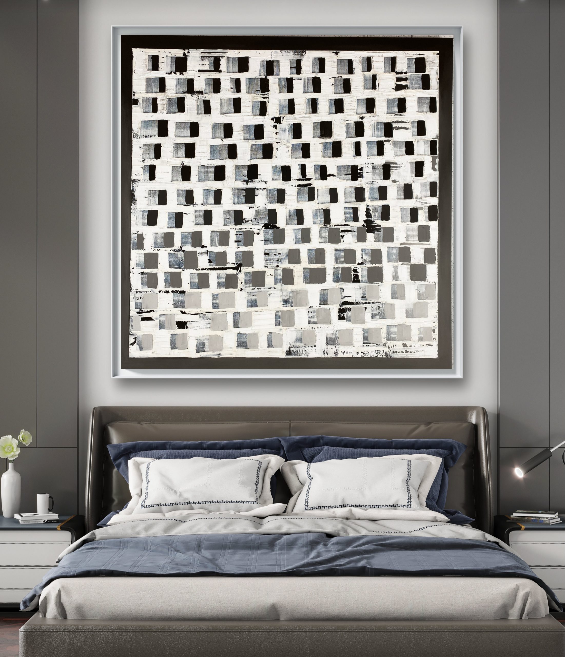 El blanco, por su parte, emerge en su pureza y fragilidad, como la luz que se filtra entre los bordes de los cuadrados. Sin embargo, al ser difuminado entre los tonos grises y negros, pierde su nitidez, recordándonos que incluso la claridad más absoluta está sujeta a la influencia de lo que la rodea.