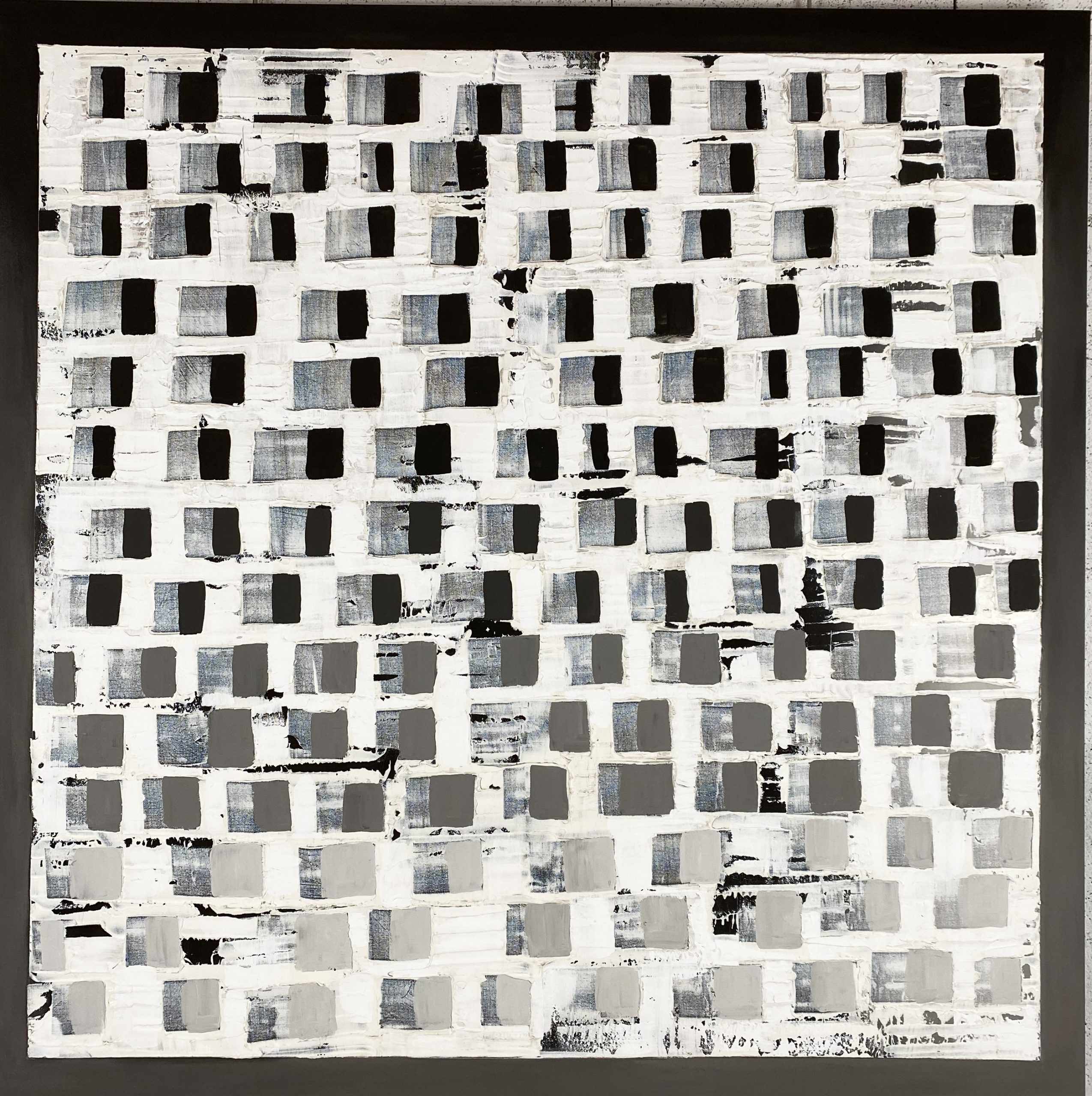 El lienzo se llena de cuadrados, trazos firmes que parecen organizar el caos, pero al mismo tiempo, se desvanecen en una transición constante entre el negro, el gris y el blanco. Cada cuadrado, con sus bordes definidos, parece ser un refugio de orden en un mundo que, sin embargo, se diluye. Los colores, fuertes en su individualidad, se mezclan en el difuminarse, sugiriendo que la claridad nunca es absoluta, que incluso lo más firme está sujeto a la disolución del tiempo y de la percepción.