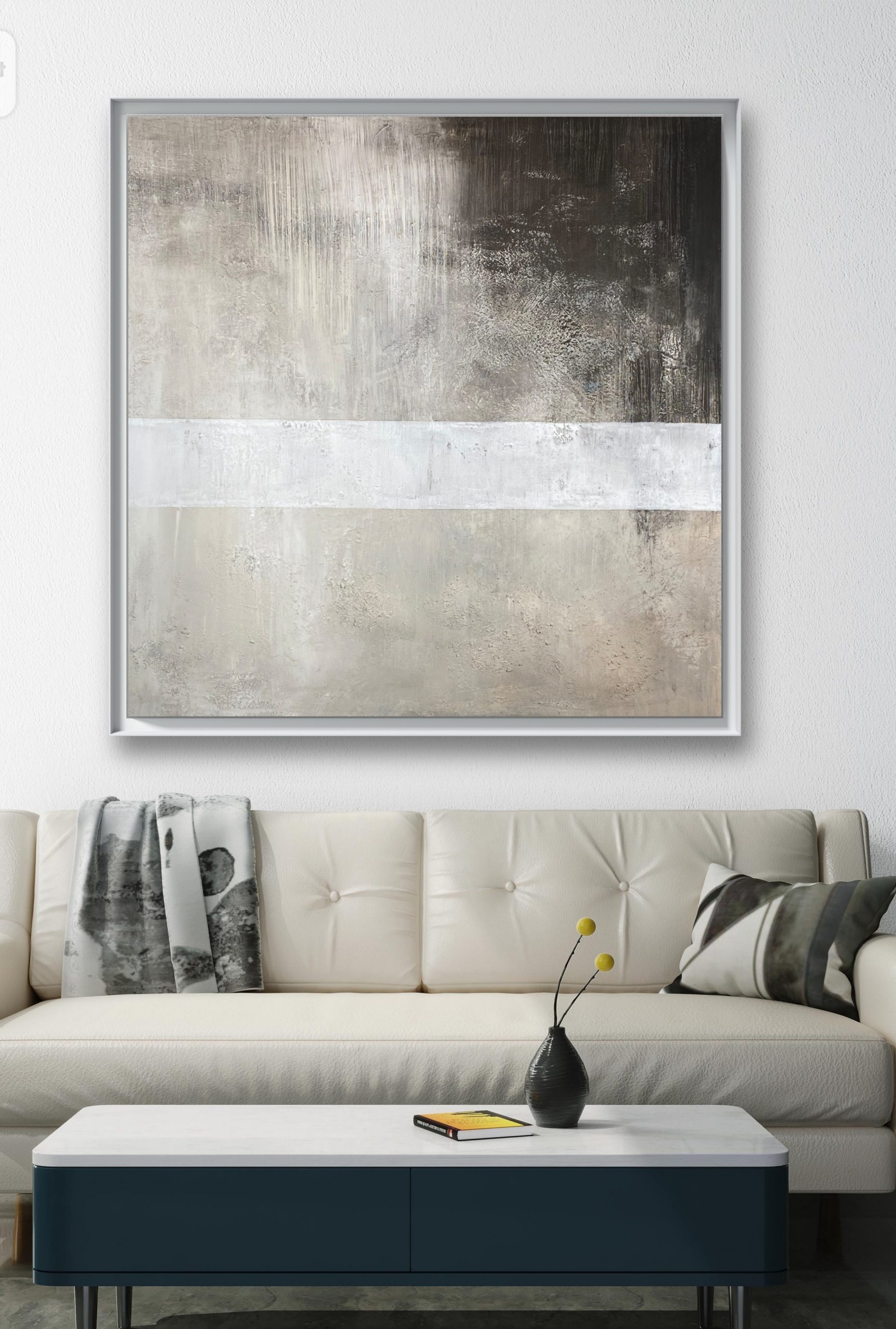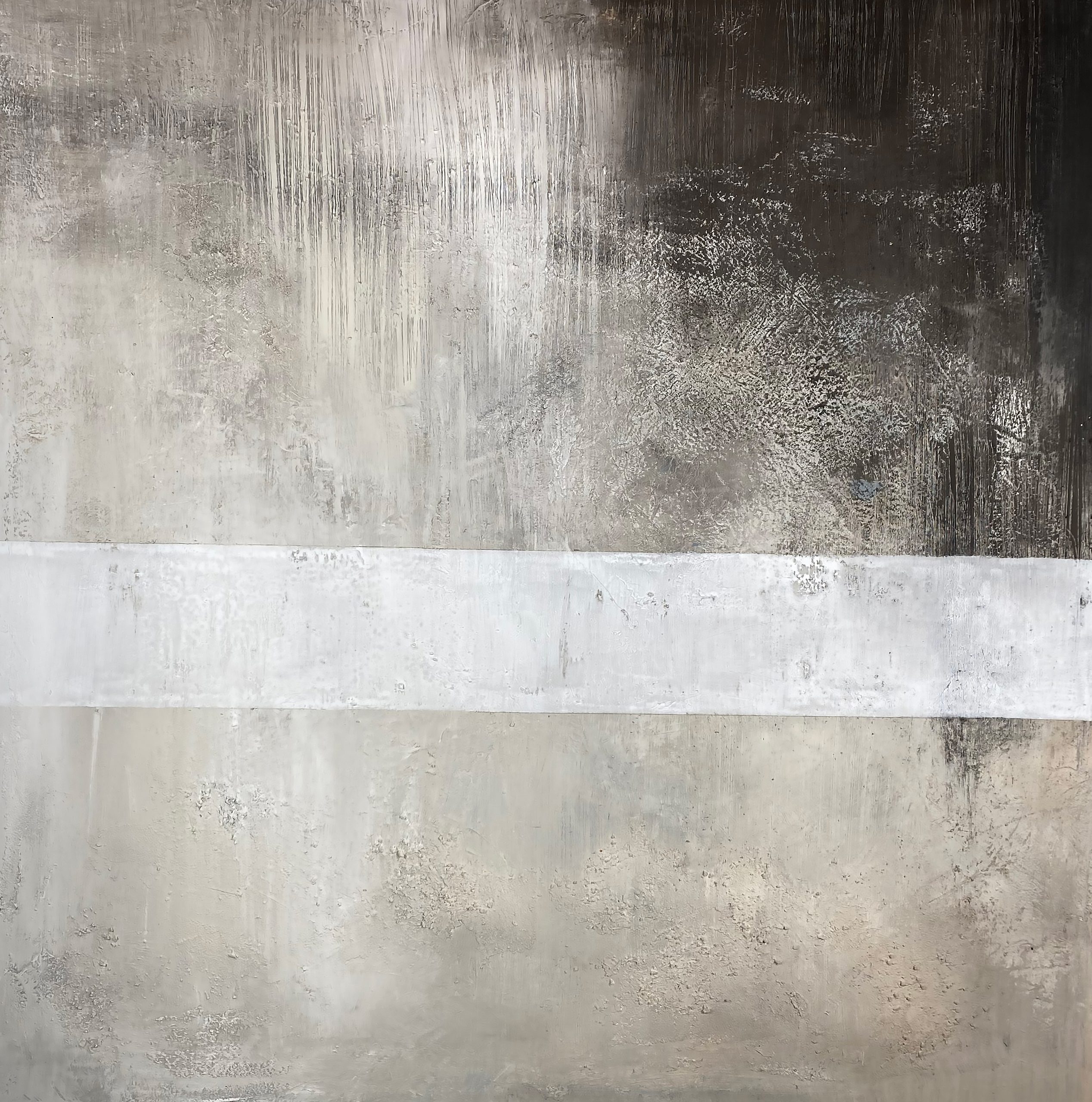 La franja blanca en el centro actúa como un faro en este paisaje de tonos neutros, un punto de referencia que nos recuerda que, incluso en medio de la ambigüedad, existe una línea clara, un espacio de serenidad que ofrece equilibrio. Esta obra, en su simplicidad y sutileza, habla del contraste entre lo absoluto y lo difuso, entre lo luminoso y lo sombrío, y nos invita a encontrar el equilibrio entre los matices que componen nuestra realidad.